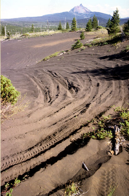 In the aftermath of the Big Lake Airstrip Fire, much of Santiam Pass was opened-up to salvage logging. These logging roads combined with firelines to provide new arterials into previously roadless areas in Santiam Pass. This was followed by twenty years of intense firewood cutting, which generated new, often random travelways through meadows that were recovering after the fire. The open terrain became a magnet for off-road vehicles that began proliferating in the early 1970s. These early dirt bikes were drawn to the steep volcanic slopes and ash deposits at Sand Mountain. With the advent of three-wheelers and the quad cycles, the effects spread as the use of those vehicles grew.