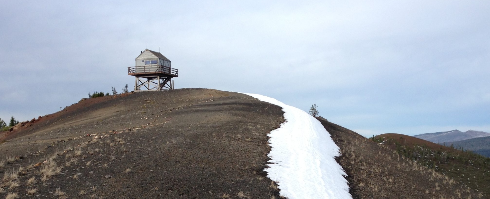 In 1933, a road was punched to the saddle between the two largest craters in the Sand Mountain Volcanic Alignment, and a “Grange hall-style” L-4 lookout cabin was constructed atop the south peak. That lookout remarkably survived the Big Lake Airstrip Fire of 1967 which swept over the top of Sand Mountain.